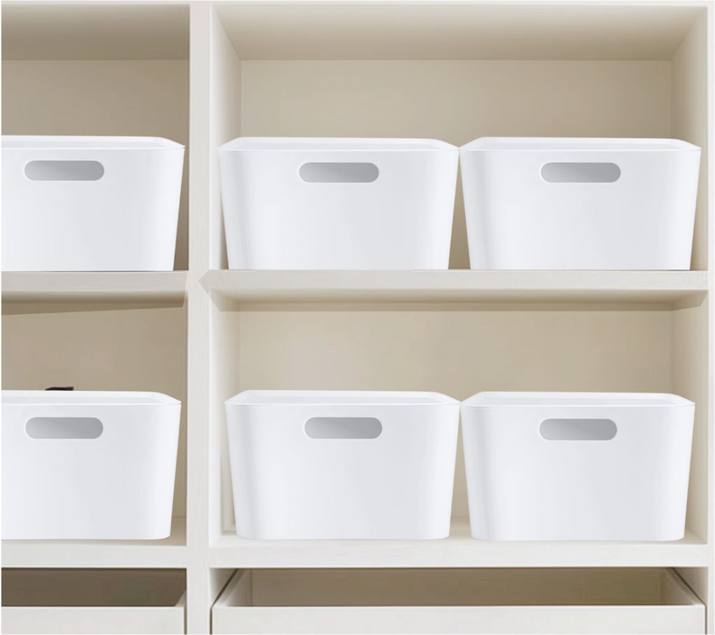 Finessy Tip: Use stackable, clear bins or white bins for categories you use daily — like snacks, office supplies, or skincare. Visibility = speed. White = control the colors.
