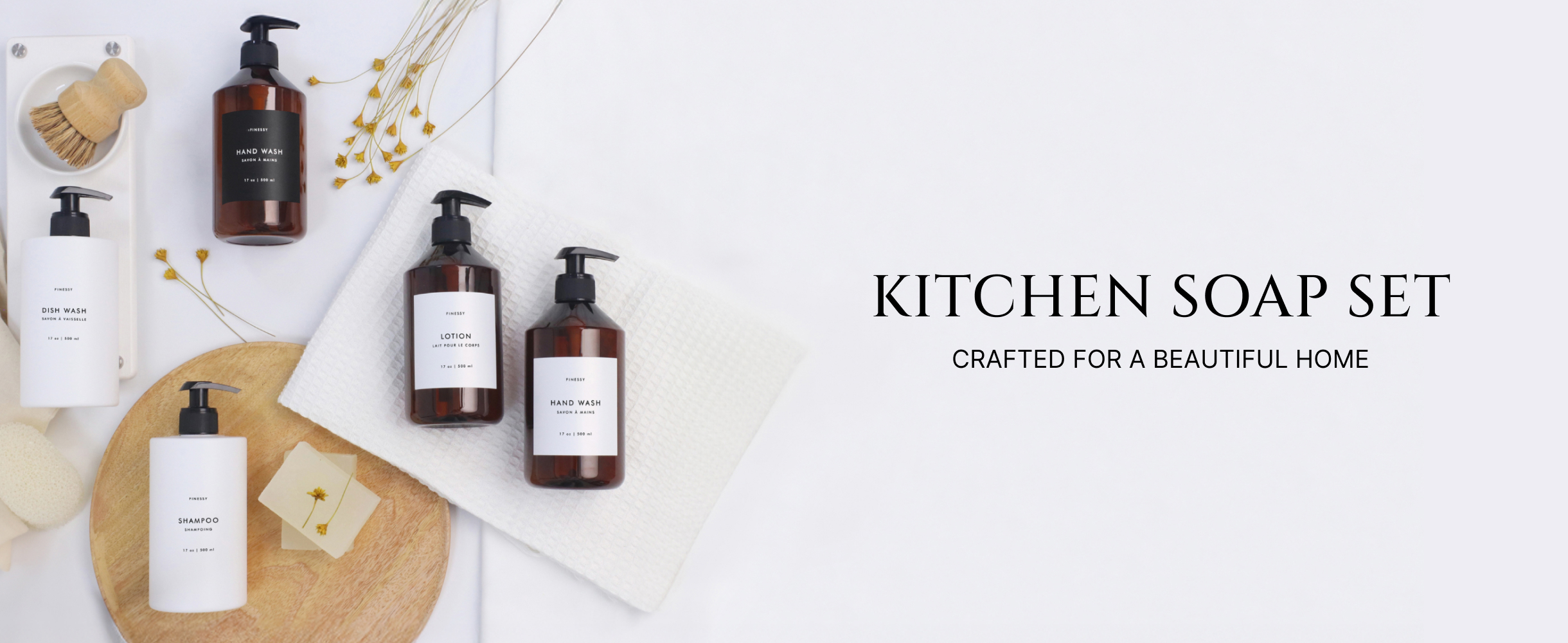 • Materials: White plastic bottles, stainless steel brackets, and pumps.