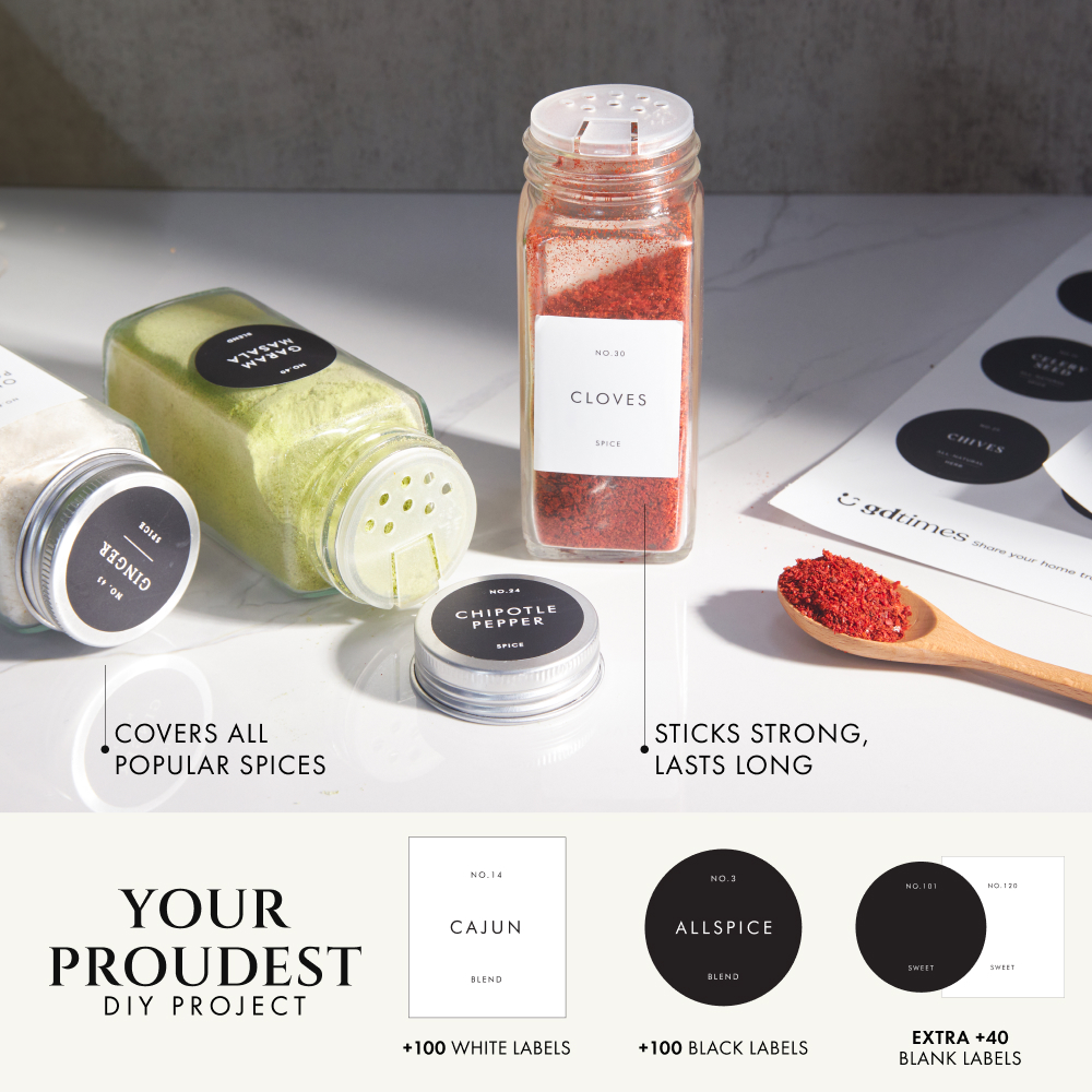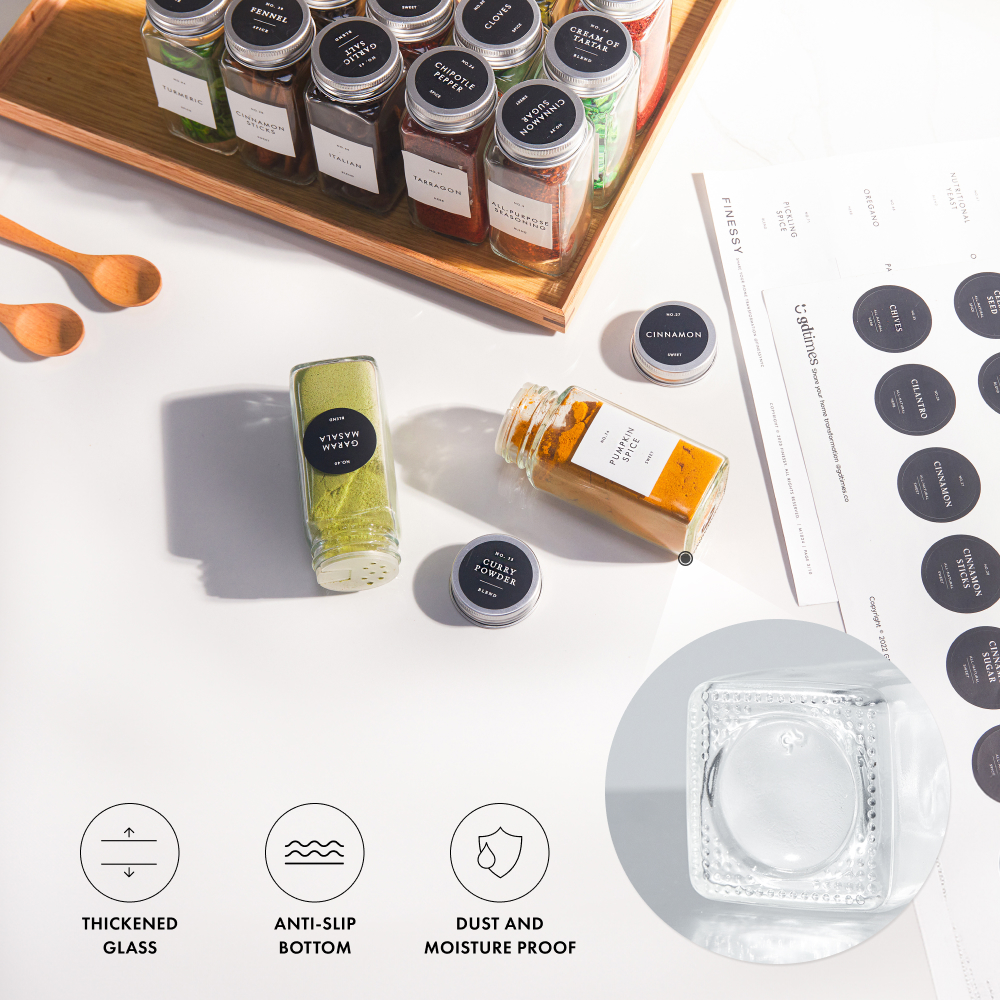 • Dream-Worthy Spice Organization: Includes 24 or 36 sturdy 4oz glass jars with airtight metal lids, 240 waterproof labels in two fonts (pre-printed and blank), and a collapsible silicone funnel for mess-free refills.